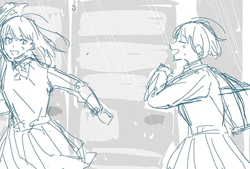 「雨の中を駆け抜ける二人」制作ラフ紹介。ここだけの制作の秘話